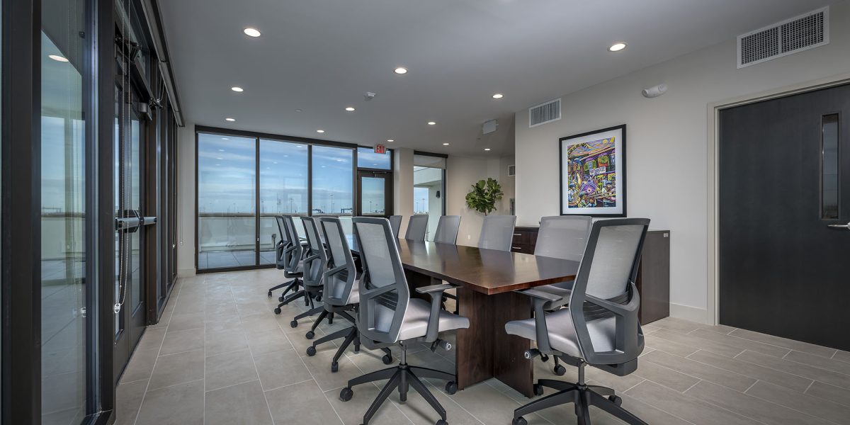 The interior features a dramatic central atrium with terrazzo flooring, a custom chandelier, and a prominent open stair connecting public-facing functions with executive spaces above. On the banking side, the program includes six private offices for the lending team and three for the branch staff. A penthouse-level boardroom offers panoramic views of the Mississippi River and serves as a dedicated meeting space.