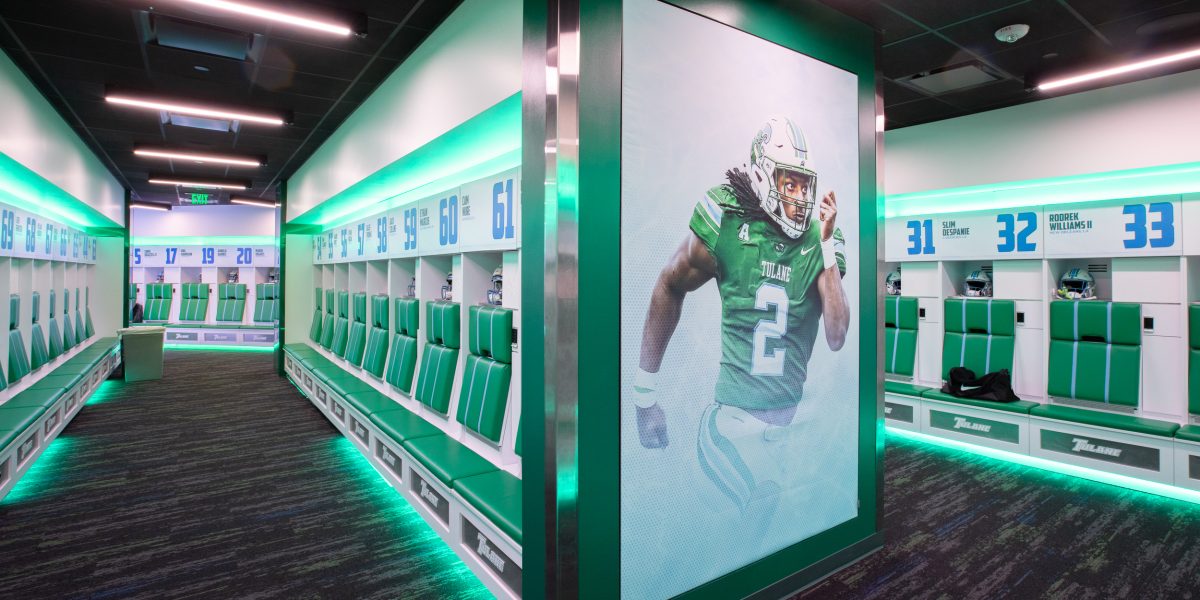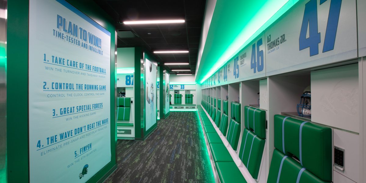 Our transformation of the Tulane University Football Locker Room aimed to elevate and align the team’s off-field environment to match its on-field expertise. Our focus was on modernizing the locker room with new state-of-the-art ventilated lockers, ensuring all sports gear stays dry and air quality is the best it can be.